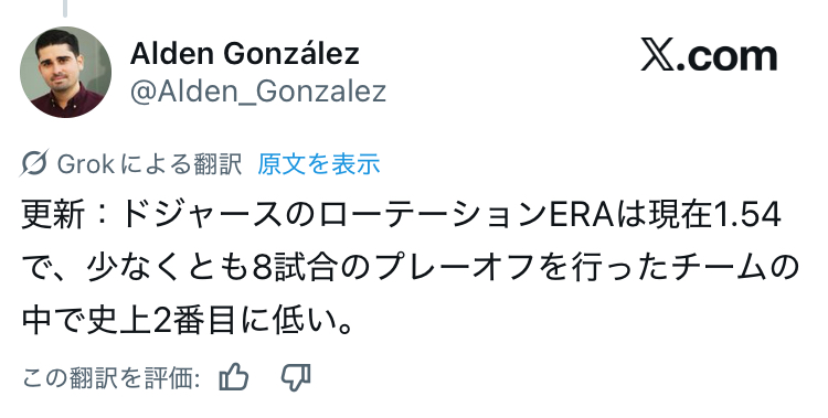 … | 78無念Nameとしあき25/10/15(水)16:37:25No.1358914726+2試合でリリーフが1イニングだけとかメジャーでは珍しそう |