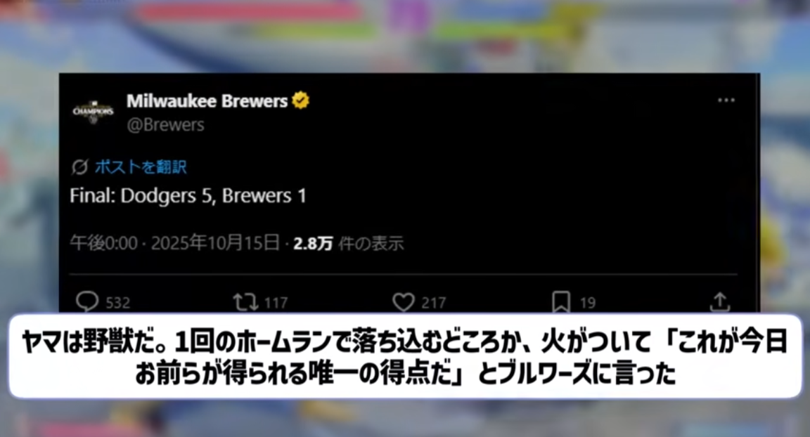 … | 86無念Nameとしあき25/10/15(水)16:39:26No.1358915079そうだねx4ブルワーズ「中継出さないとは卑怯なり!」 |