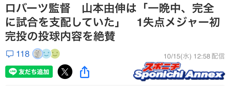 … | 667無念Nameとしあき25/10/15(水)20:08:32No.1358964016+>山本由伸「負けることは選択肢にない」 |