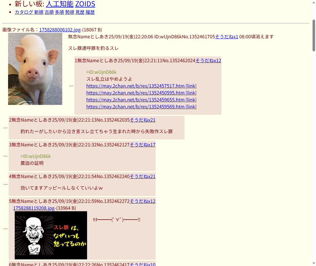 スレ豚を連呼する荒らしが唯一自治になれる掲示板このスレは古いので、もうすぐ消えます。