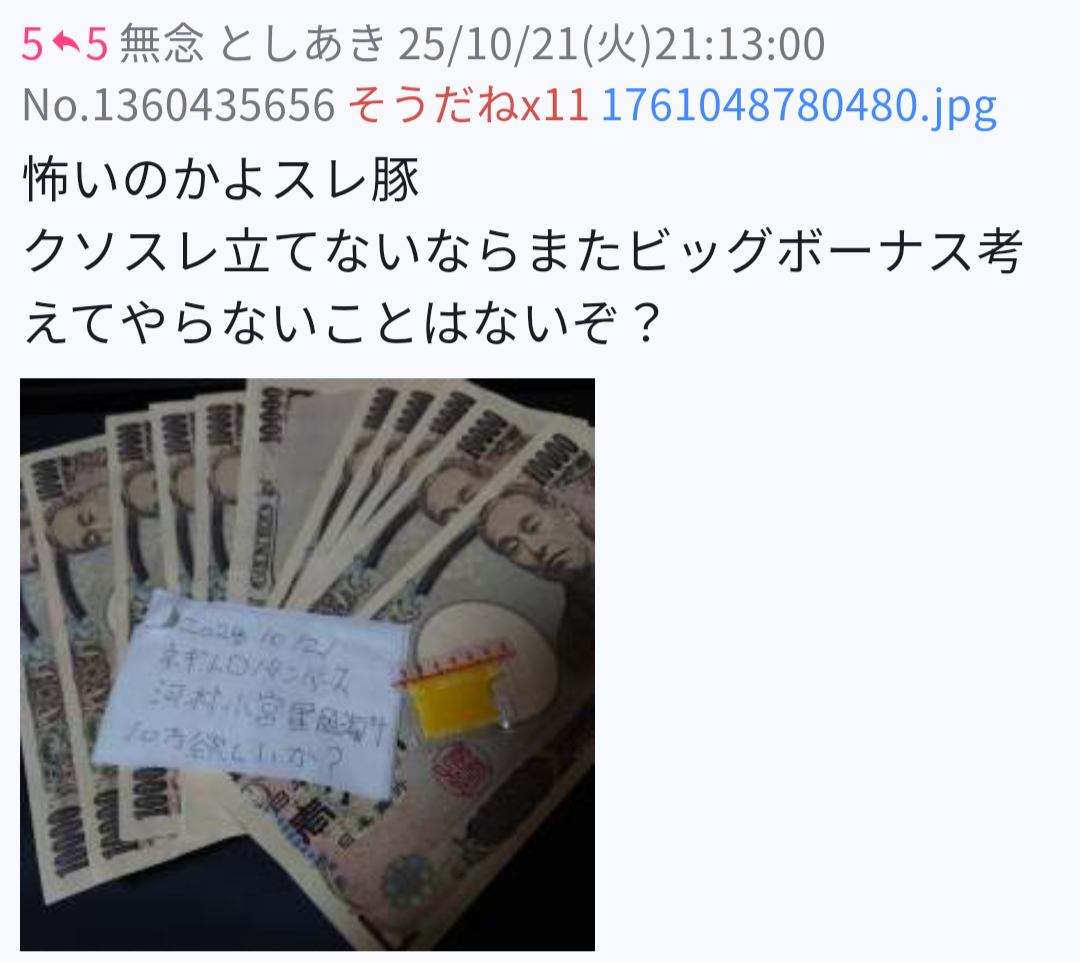 … | 6無念Nameとしあき25/10/21(火)21:14:31No.1360436154そうだねx12>怖いのかよスレ豚 |