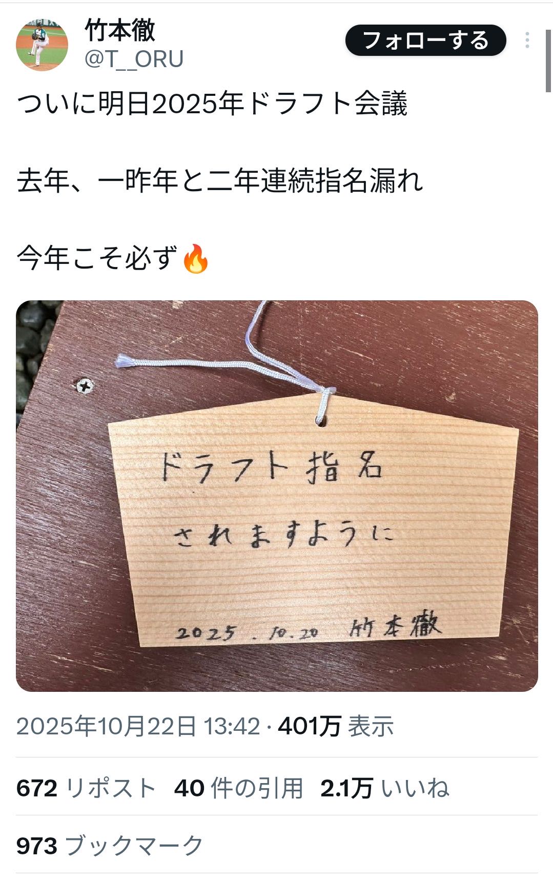 | … | 920無念Nameとしあき25/10/24(金)05:46:58No.1360940313+>入団の勝算あってのニ球団指名なんです? |