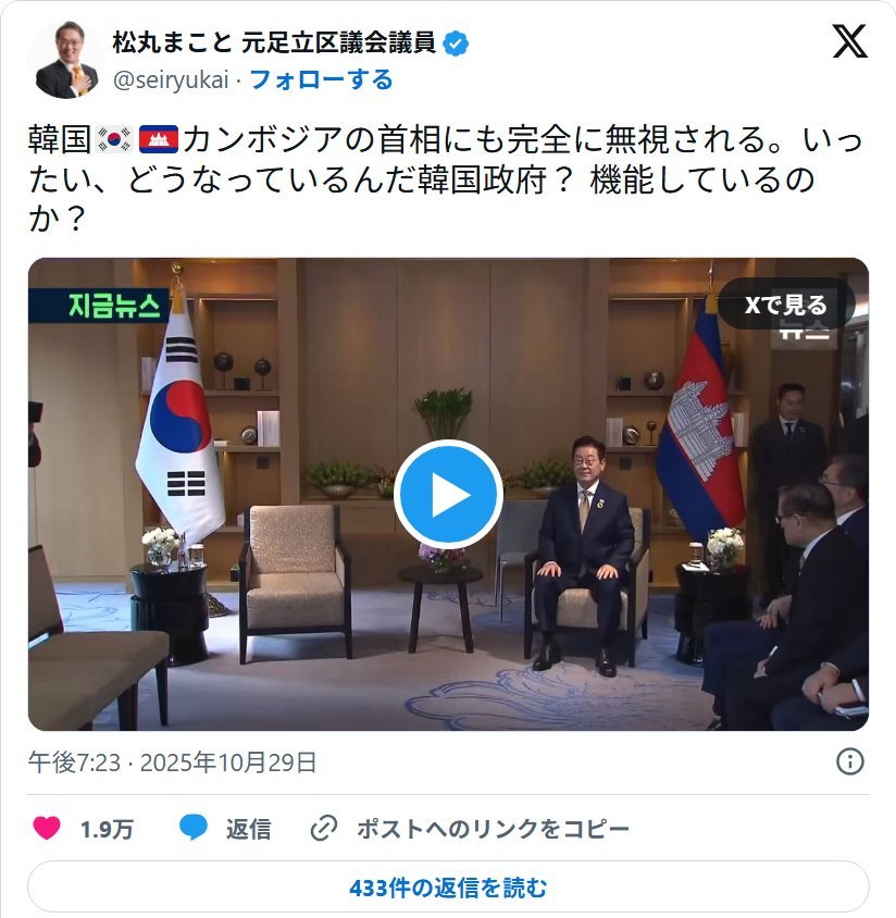 | … | 536無念Nameとしあき25/10/31(金)15:01:30No.1362707394+>ってXでは韓国と仲良くするなって言ってるアカウントは袋叩きにあってる |
