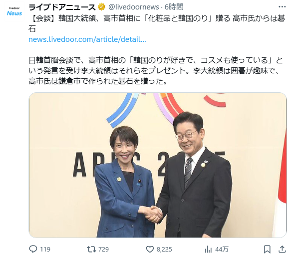| … | 50無念Nameとしあき25/10/31(金)11:03:49No.1362664980そうだねx4>高市に韓国コスメと海苔プレゼントしてて笑った |