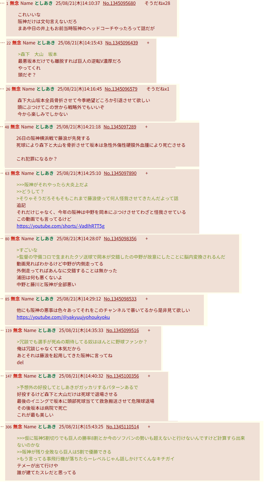 | … | 909無念Nameとしあき25/10/31(金)20:20:10No.1362774292+>素人はいいけど野球解説者で阪神優勝と予想していた奴等は節穴だから解説やめろ |