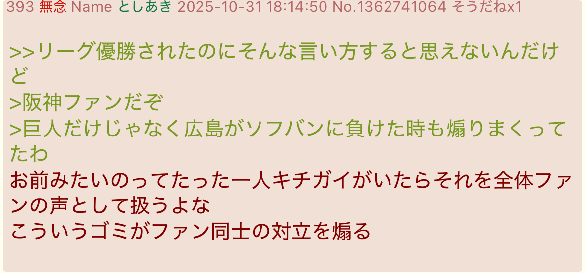 | … | 917無念Nameとしあき25/10/31(金)20:22:39No.1362775057そうだねx2阪神ファンが叩かれたくないから必死こいて巨人叩きしてるのが余計に惨めやな |