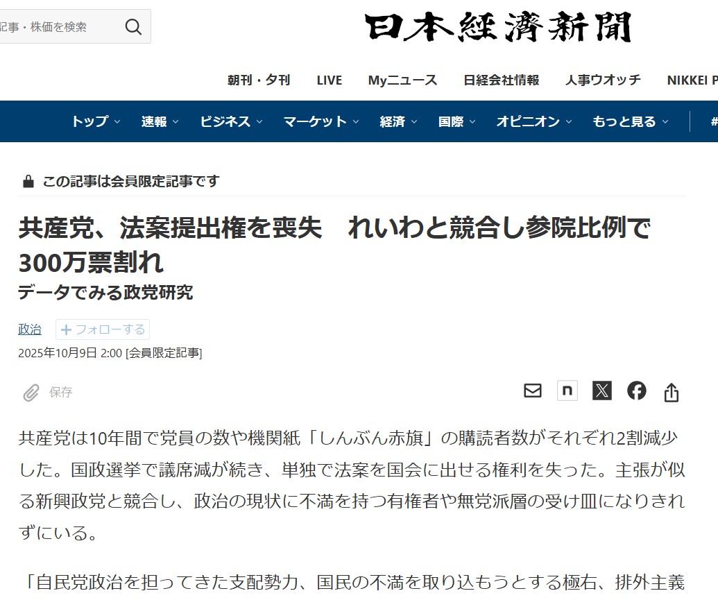 | … | 572無念Nameとしあき25/11/03(月)22:35:54No.1363635810+この物価高だと普通は共産の議席伸びる情勢だったはずなのに参院選負けたあたり  |