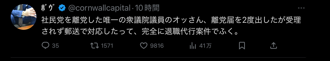 | … | 91無念Nameとしあき25/11/03(月)20:23:57No.1363597527そうだねx4先日離党した社民のおっさんが言うように  |