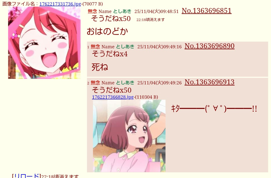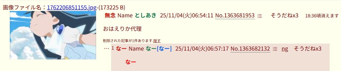| … | 3無念Nameとしあき25/11/04(火)07:12:13No.1363682978そうだねx1おはえりか^〜 |