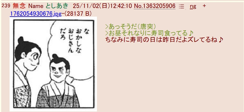 | … | 269無念Nameとしあき25/11/04(火)15:08:49No.1363745915+>>sage爺は食事を支援してもらわないと食べられないのか |