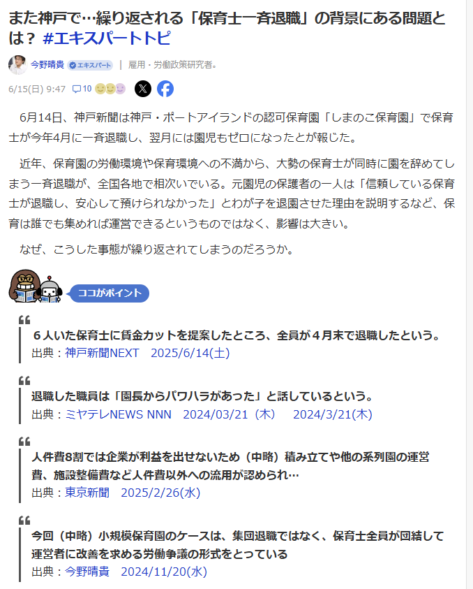 | … | 591無念Nameとしあき25/11/04(火)16:35:18No.1363758431+>>保育士が一斉に辞めるという事態に対して経営者がやれることなんか無いから |