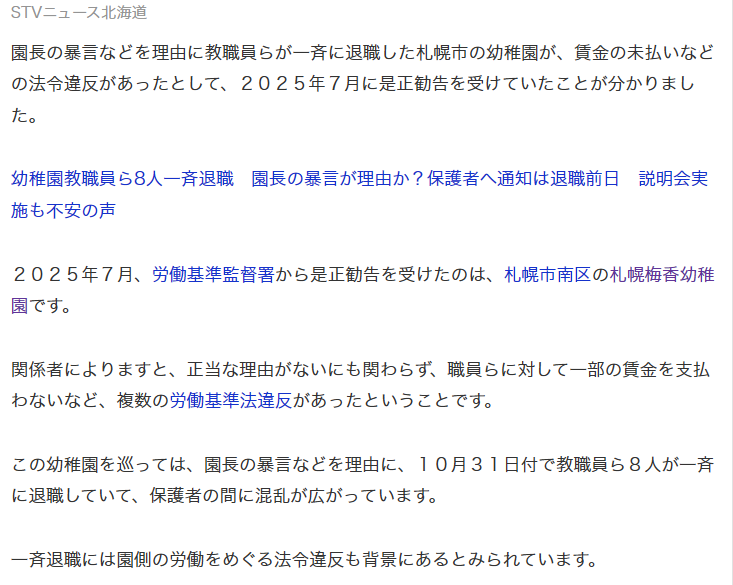 | … | 13無念Nameとしあき25/11/04(火)08:44:03No.1363690565+札幌市内では、2024年にも別の運営法人の保育園で保育士の大量退職が発生し、休園や認可取り消しに至った事例があり |