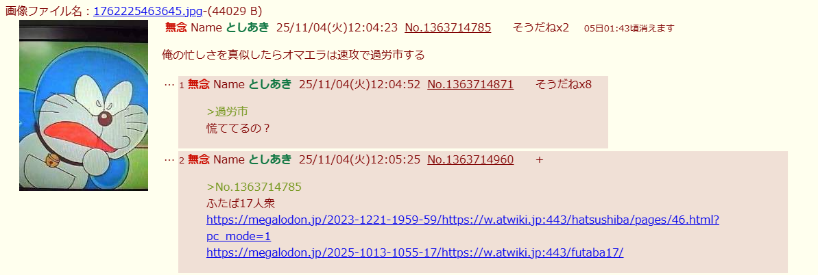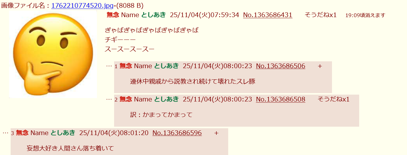 | … | 3無念Nameとしあき25/11/04(火)09:15:45No.1363693409そうだねx8>俺たちとしあ |