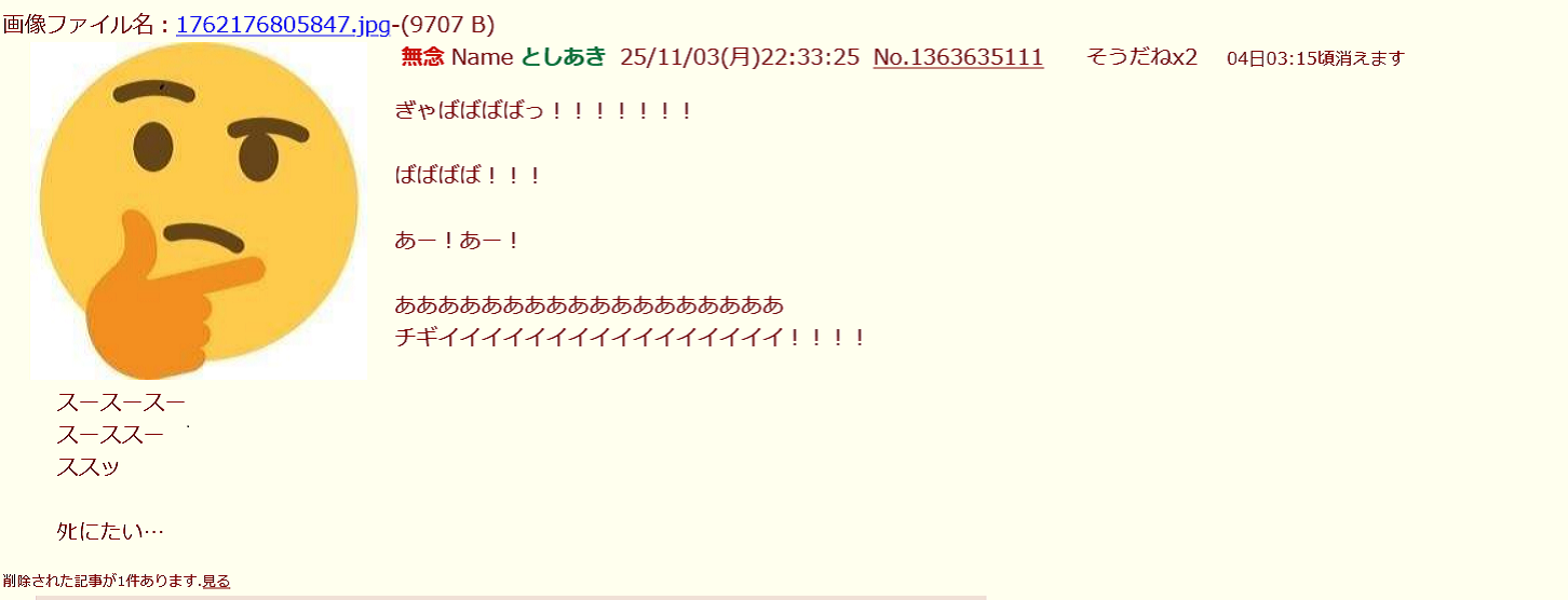 | … | 370無念Nameとしあき25/11/04(火)12:41:20No.1363722383+ 1762227680652.png-(179825 B) 過労市と言ってたスレ消したな |