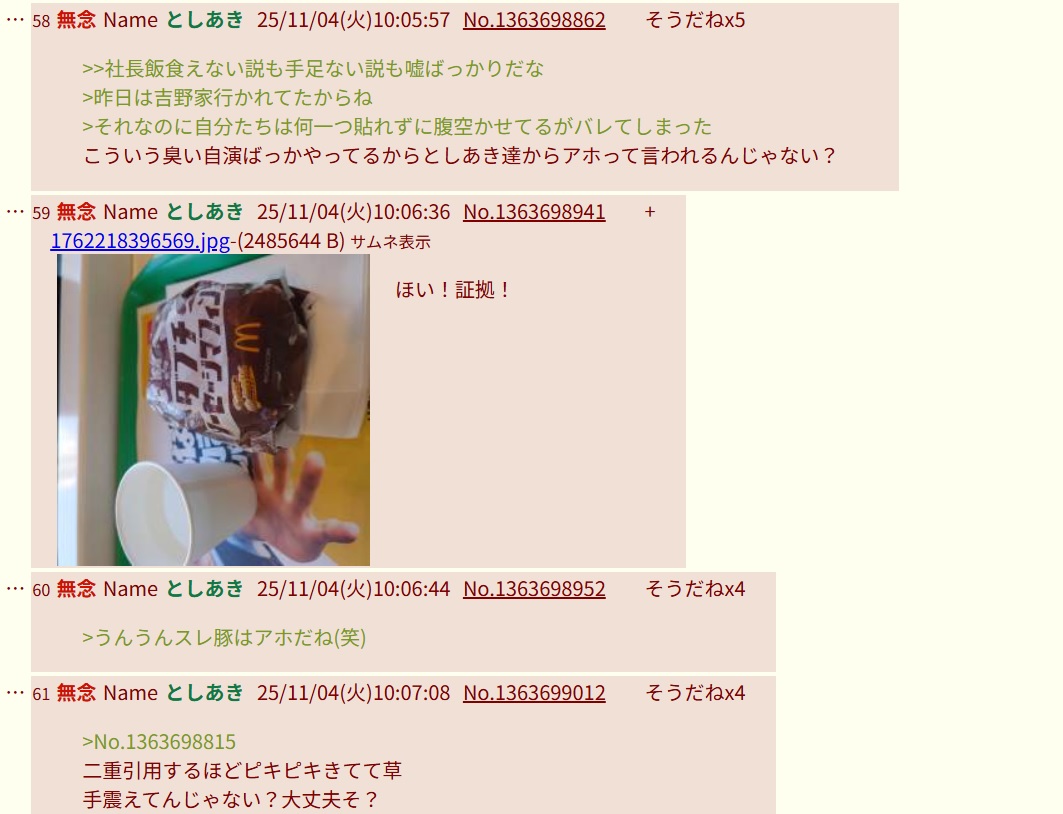 | … | 56無念Nameとしあき25/11/04(火)10:05:34No.1363698815+>550円のバーガー1個で何をドヤってんの統失スレ豚ちゃん? |