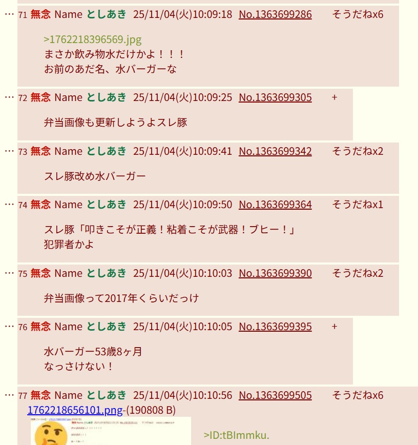 | … | 73無念Nameとしあき25/11/04(火)10:09:41No.1363699342そうだねx3スレ豚改め水バーガー |