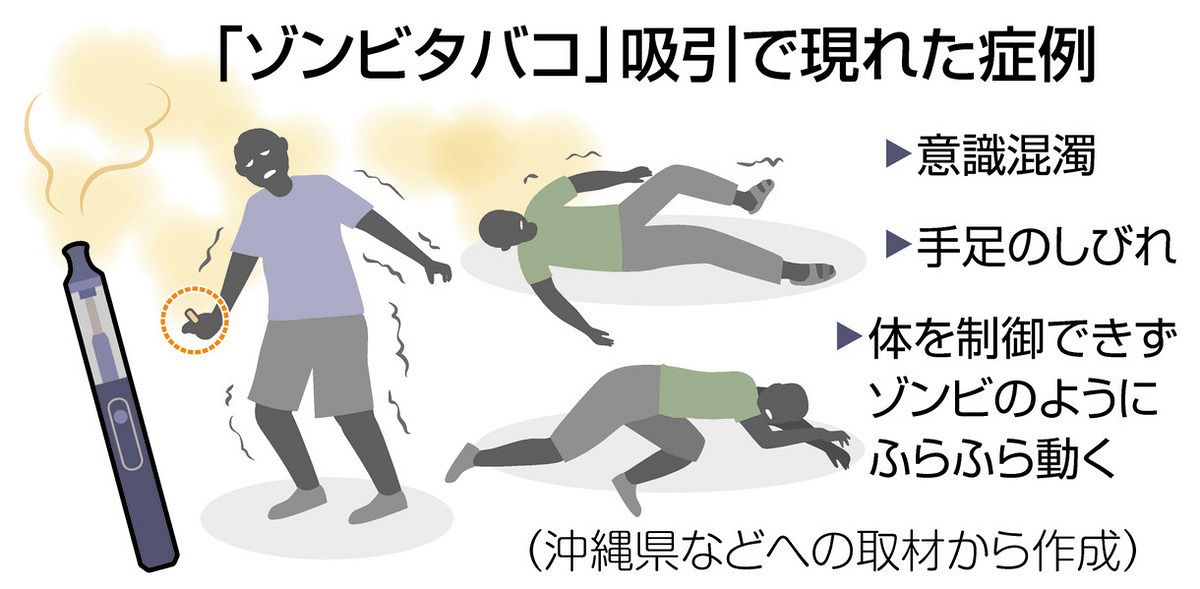 若年層を中心に、指定薬物「エトミデート」の乱用が広がりつつある。海外では医療用として使用されるが、過剰摂取すると、手足がけいれんすることなどから「ゾンビたばこ」とも呼ばれる。今年に入り沖縄県を中心に摘発が相次いでおり、密輸グループも逮捕。首都圏で売りさばいた疑いがあり、捜査当局は全国でまん延する可能性もあるとみて、警戒を強めている。