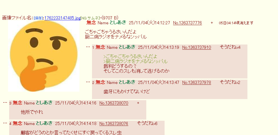 | … | 1無念Nameとしあき25/11/04(火)14:13:19No.1363737910そうだねx7>ごちゃごちゃうるさいんだよ |