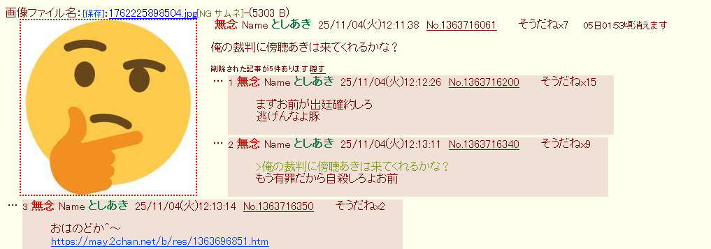| … | 5無念Nameとしあき25/11/04(火)14:15:00No.1363738180そうだねx5裁判怖い? |