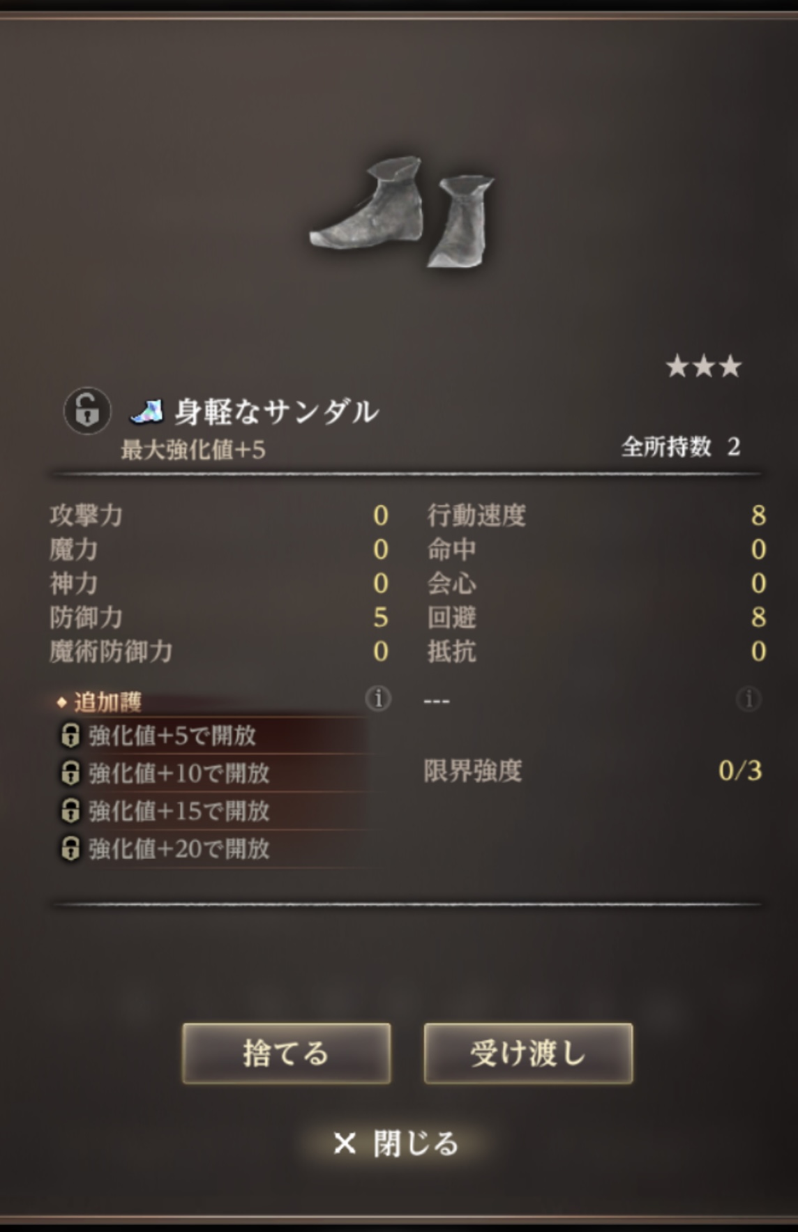 | … | 84無念Nameとしあき25/11/04(火)17:34:43 ID:ol4H5Lm6No.1363767693そうだねx1>身軽なサンダルや盗賊の靴は素で回避が高いから売らずに大事にしてくれ |