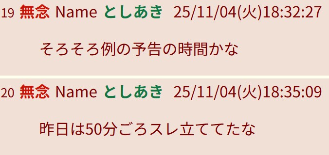 | … | 41無念Nameとしあき25/11/04(火)19:01:54No.1363785511そうだねx1というか19時か |