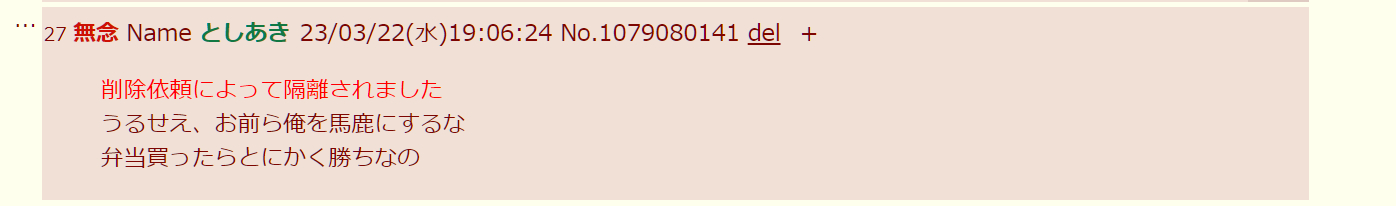 | … | 25無念Nameとしあき25/11/04(火)18:56:43No.1363784315+でも19時弁当スレで絶対タロットやるよあの豚 |