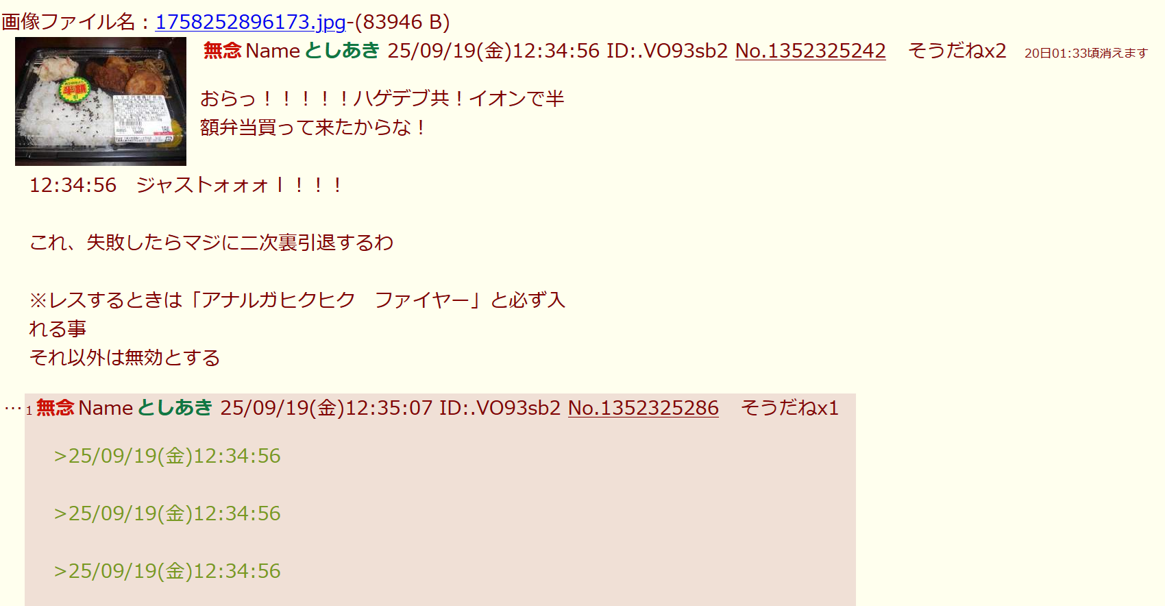 | … | 89無念Nameとしあき25/11/04(火)19:49:10No.1363797529+半額弁当買ってきた証拠もなしにただ時間ぴったりに古い画像でスレ立てただけでなにが失敗したらマジに二次裏引退するなの? |