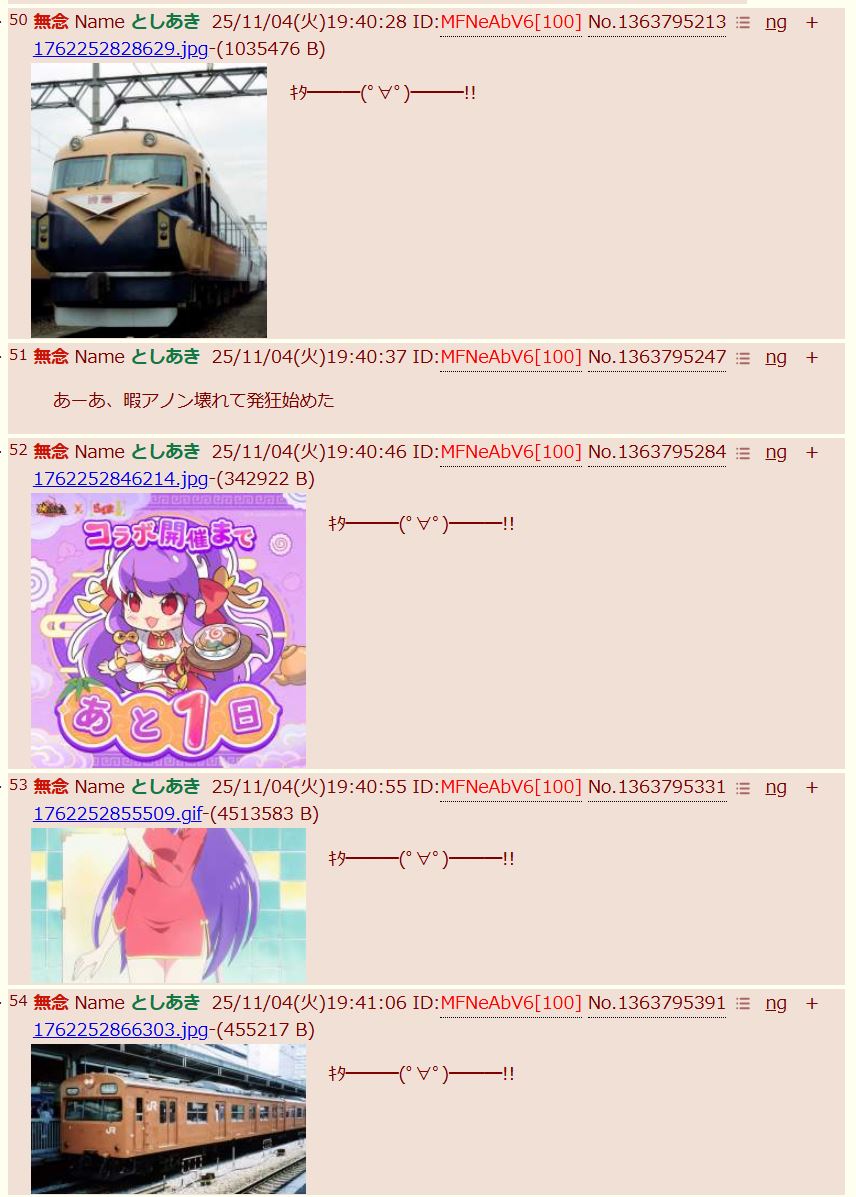 | … | 51無念Nameとしあき25/11/04(火)19:40:37 ID:MFNeAbV6No.1363795247+あーあ、暇アノン壊れて発狂始めた |