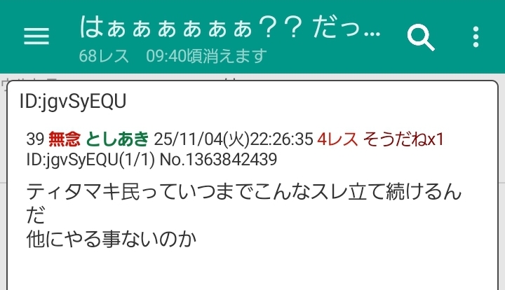 | … | 50無念Nameとしあき25/11/04(火)22:30:17No.1363843431そうだねx5>ティタマキ民っていつまでこんなスレ立て続けるんだ |