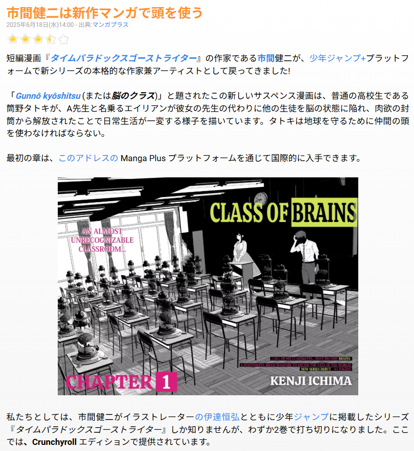 | … | 35無念Nameとしあき25/11/05(水)02:52:30No.1363882446そうだねx6>亜人の王はトーナメント展開で打ち切り(少なくともジャンプラからは)になったけど群脳は無事トーナメントを超えて連載できるんだろうか…出来る気がしないなぁ |
