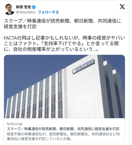 | … | 10無念Nameとしあき25/11/05(水)00:51:31No.1363871443そうだねx58>時事通信が読売新聞、朝日新聞、共同通信に経営支援を打診 |