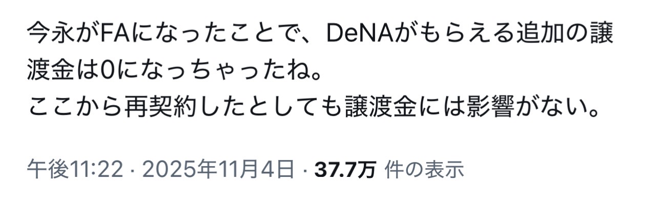| … | 21無念Nameとしあき25/11/05(水)06:35:05No.1363888846+>>カブス今永昇太がFAに 3年86億円のオプション拒否 米メディア |