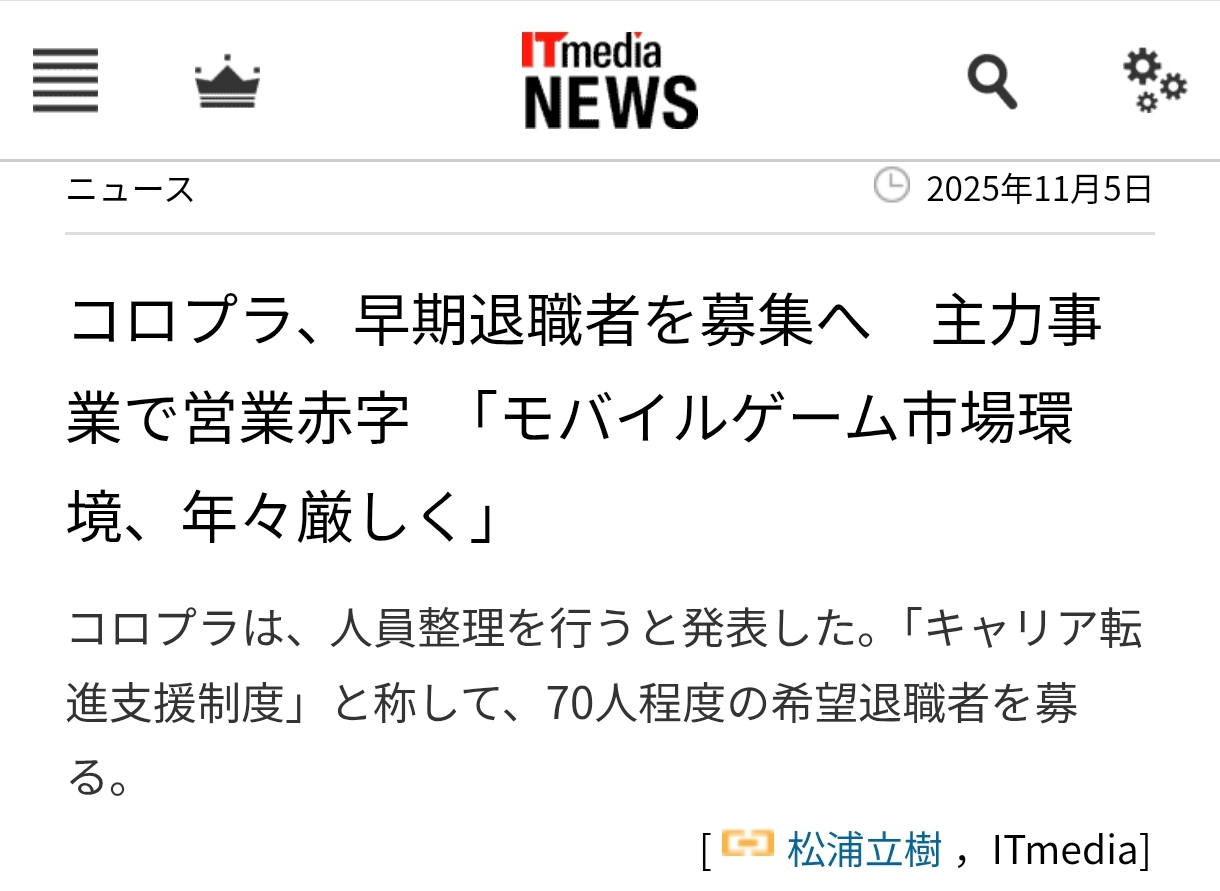 | … | 596無念Nameとしあき25/11/05(水)19:10:01No.1364002378+>なんかヤフーにコロプラの早期退職者募集の記事が…っす |