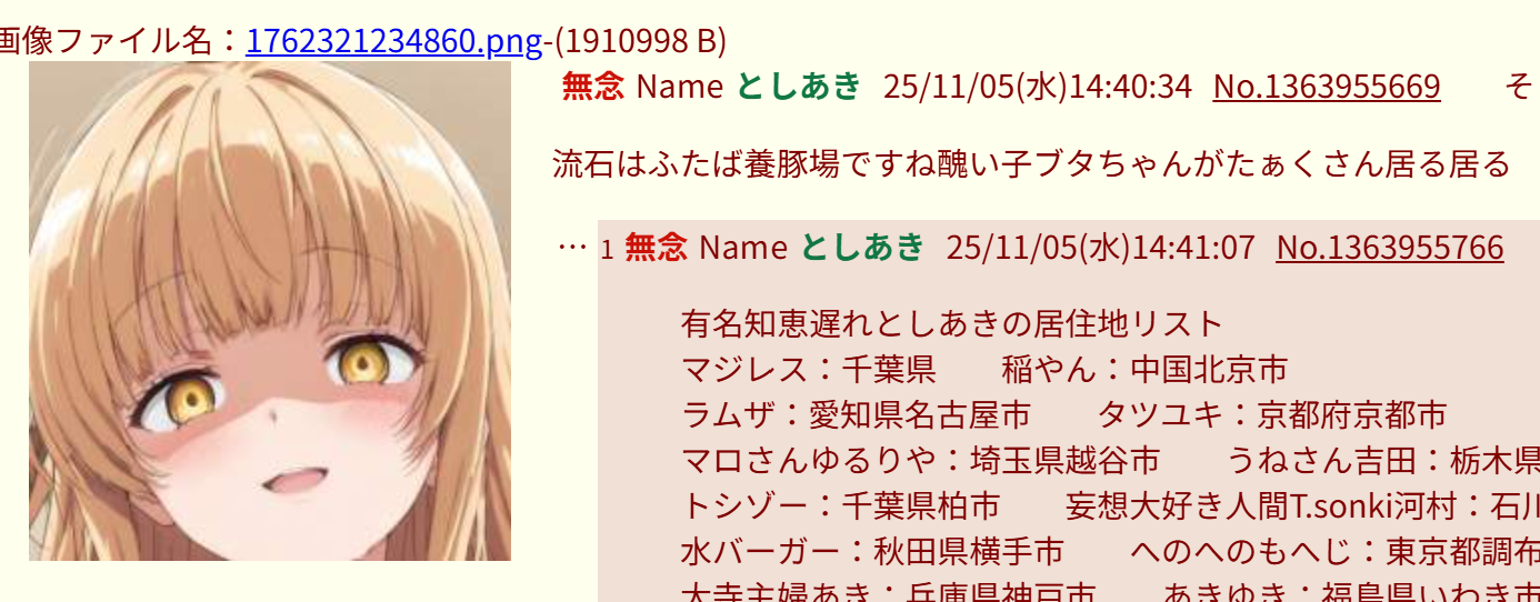 | … | 274無念Nameとしあき25/11/05(水)18:22:16No.1363992079そうだねx1有名知恵遅れとしあきの居住地リスト |