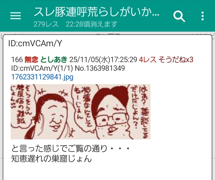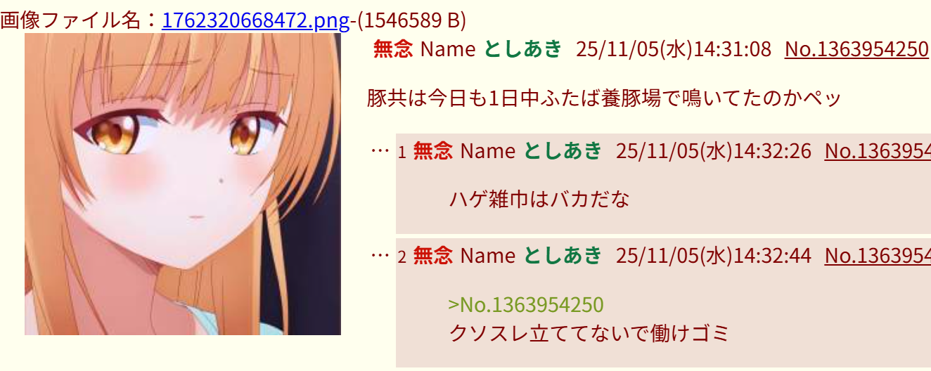 | … | 3無念Nameとしあき25/11/05(水)16:17:37No.1363970699そうだねx22 1762327057400.jpg-(8291 B) >スレ豚連呼荒らしがいかに嫌われているか… |