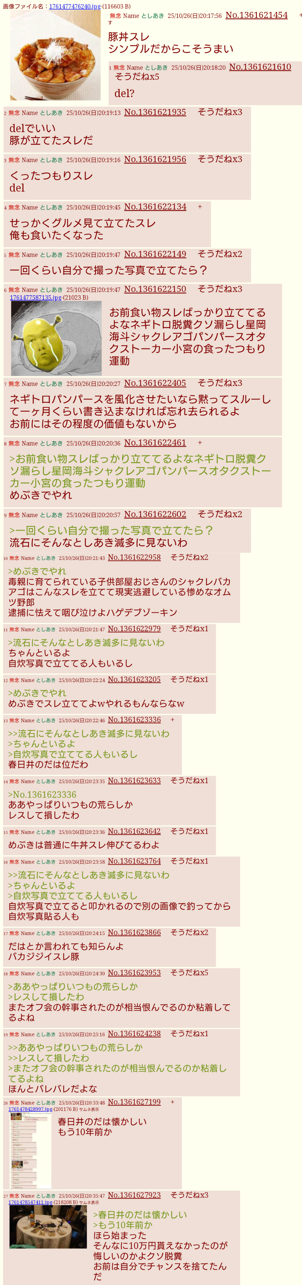 | … | 251無念Nameとしあき25/11/05(水)17:47:38No.1363985261そうだねx1>>つまり本人達は自傷行為覚悟で晒したのに |