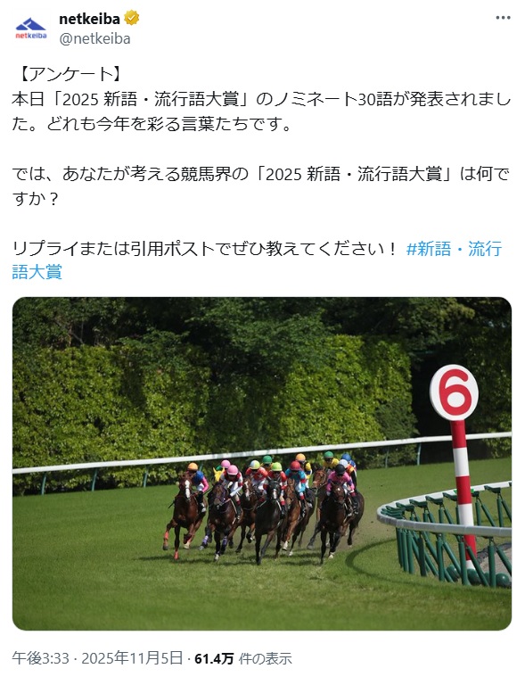 | … | 915無念Nameとしあき25/11/05(水)19:10:36No.1364002534そうだねx1>>>競馬界新語流行語大賞かー |