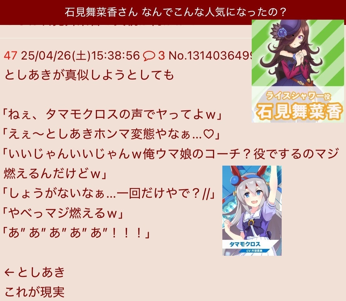 | … | 350無念Nameとしあき25/11/05(水)22:31:48No.1364061078+本が友達と言いながらイケメンちんぽ大好き声優 |