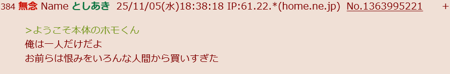 | … | 48無念Nameとしあき sage25/11/05(水)19:38:19 IP:106.133.*(au-net.ne.jp)No.1364009501そうだねx14>俺は一人だよ |