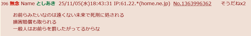 | … | 416無念Nameとしあき sage25/11/05(水)23:27:17 IP:36.12.*(dion.ne.jp)No.1364074435そうだねx3ネームネームネーム |