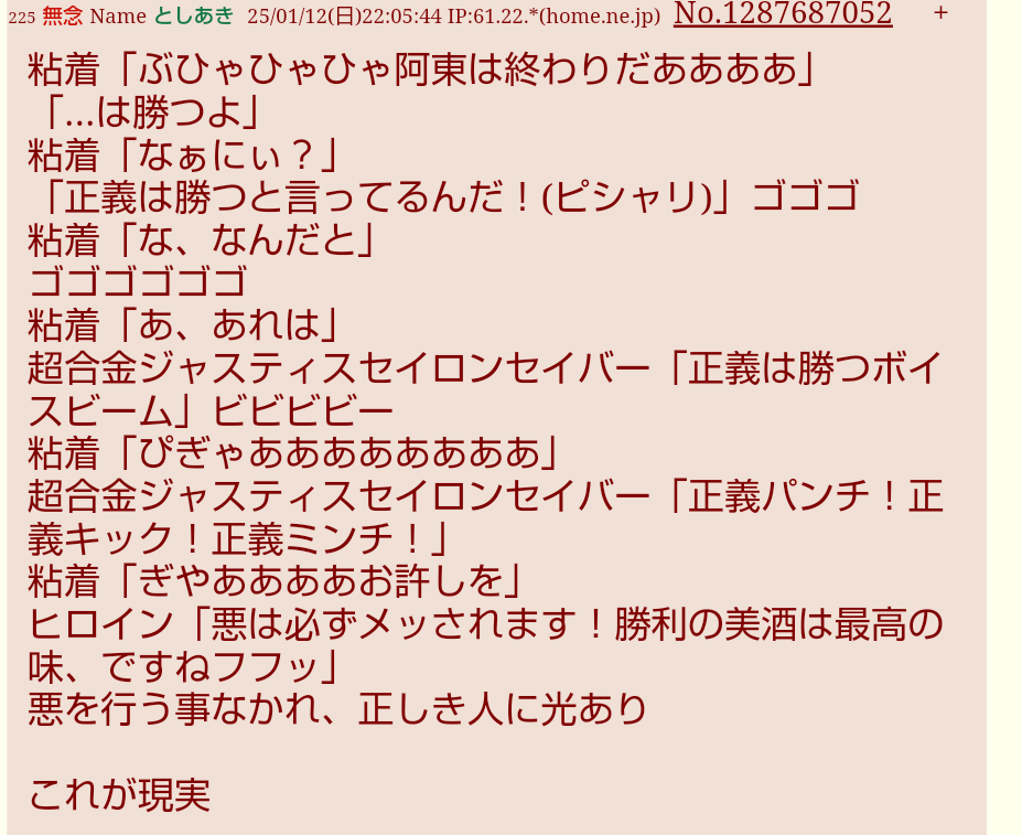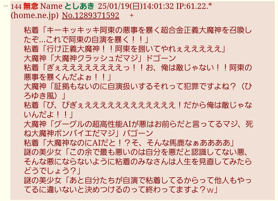 | … | 20無念Nameとしあき よく聞きなさい25/11/05(水)19:18:38 IP:49.104.*(spmode.ne.jp)No.1364004455そうだねx4「粘着アンチがー」ってXでファンネルけしかけてた奴が言う台詞じゃねーなの |