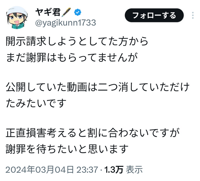 | … | 97無念Nameとしあき ステマの人だ25/11/05(水)20:16:32 IP:27.253.*(bmobile.ne.jp)No.1364019813そうだねx6開示しろ→って言ってるけどどうする?→やだ!→じゃあ裁判な→(原告が勝訴した場合)個人情報開示 |
