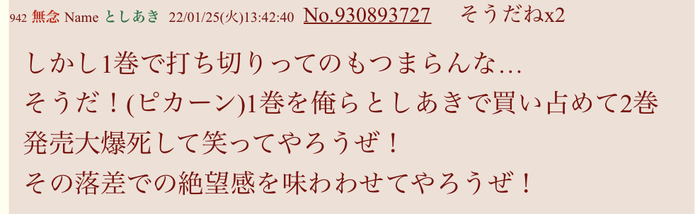 | … | 423無念Nameとしあき sage25/11/05(水)23:33:11 IP:1.0.*(megaegg.ne.jp)No.1364075684+>研究が進み漫画家としてはもちろん人としてどうなんだって言われるようになったところで裁判編という完全に見放されるターニングポイントへ |