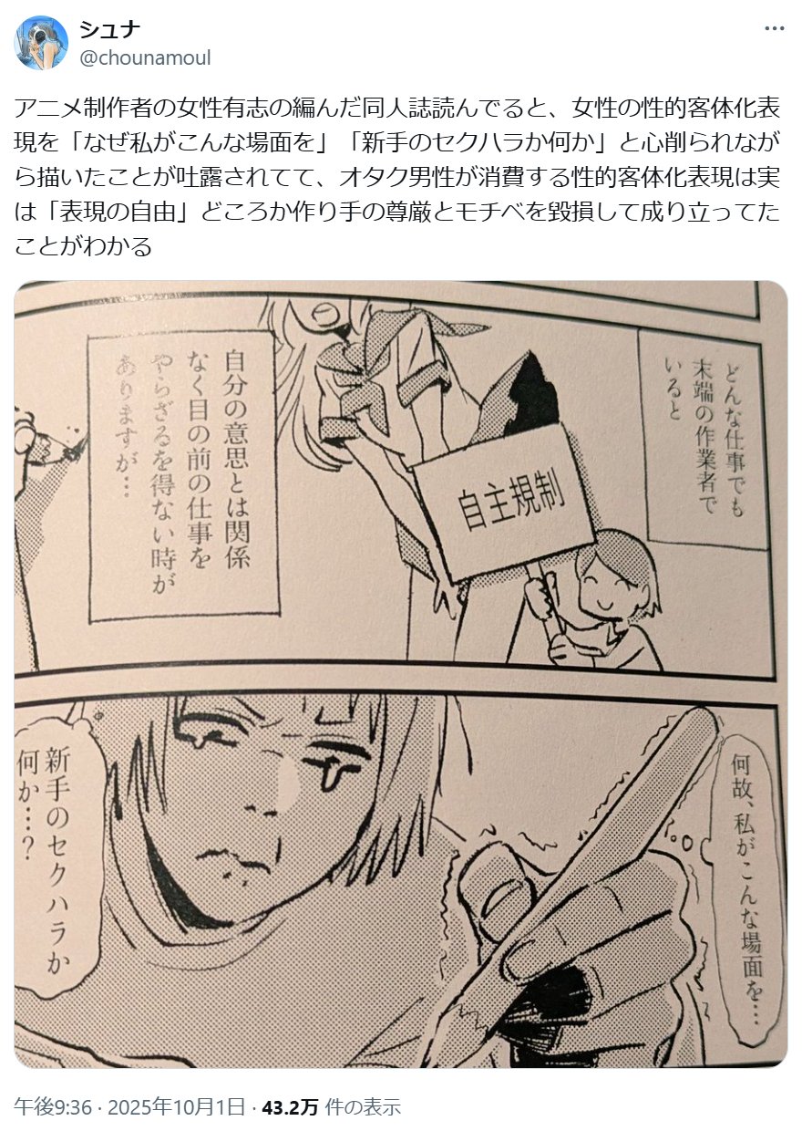 | … | 358無念Nameとしあき なの25/11/05(水)22:41:38 IP:106.146.*(au-net.ne.jp)No.1364063753+>趣味で描いてますとか漫画が好きだから描いてますとかいうくせに |