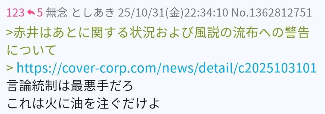 | … | 501無念Nameとしあき25/11/06(木)00:55:30No.1364089436そうだねx1> https://www.anycolor.co.jp/news/8hb6b4nrh-w7 [link] |