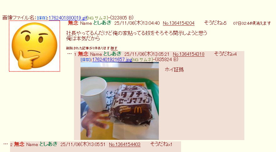 | … | 6無念Nameとしあき25/11/07(金)12:33:59No.1364363802そうだねx10頭の足りない爺さんまた社長ごっこ? |