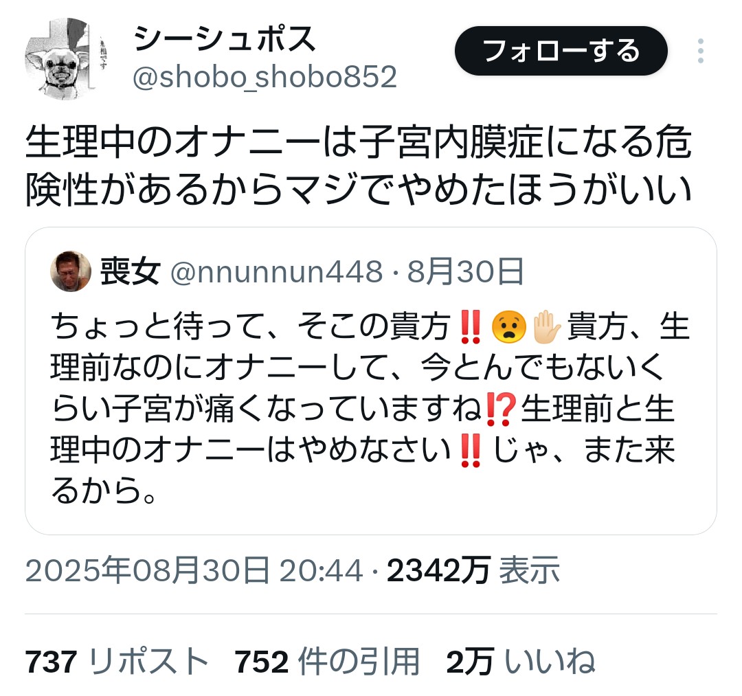 | … | 625無念Nameとしあき25/11/17(月)08:27:52No.1366725913+女の生理神話なんて信じてる奴は童貞くらいでしょ |