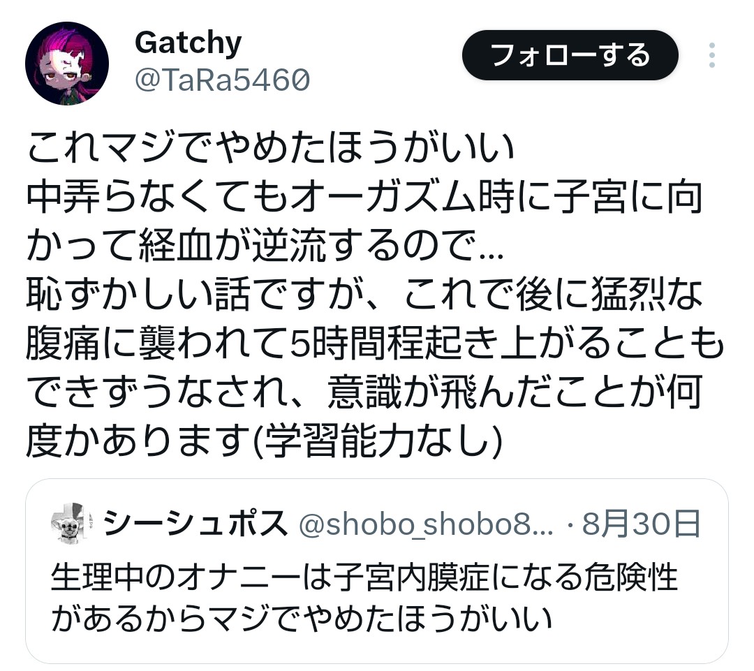 | … | 29無念Nameとしあき25/11/16(日)21:57:40No.1366656633+>>全然本人生理来てる事に気が付かないレベルの軽い人も居れば起き上がれなくなる位重い人も居る |