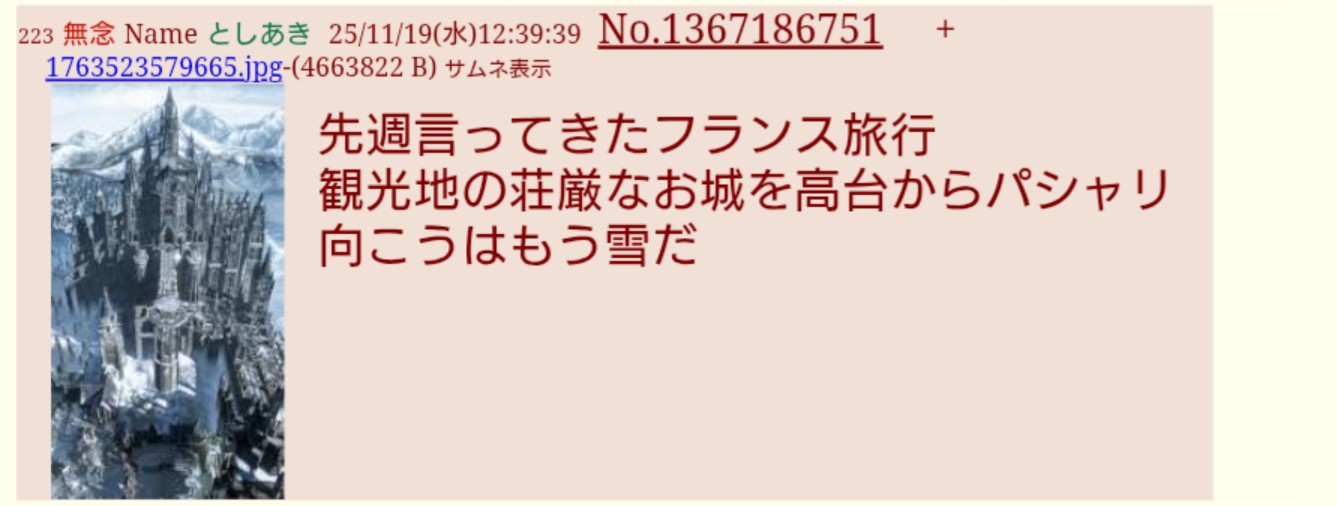 | … | 45無念Nameとしあき25/11/20(木)10:03:50No.1367388583そうだねx7 1763600630711.jpg-(103763 B) >フランス旅行 |