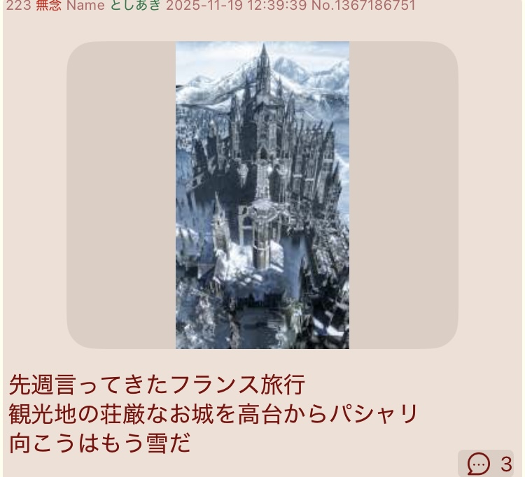 | … | 23無念Nameとしあき25/11/20(木)08:06:19No.1367375320そうだねx10 1763593579548.jpg-(92002 B) アノロンをフランス旅行で見た城扱いは流石に草生えた |